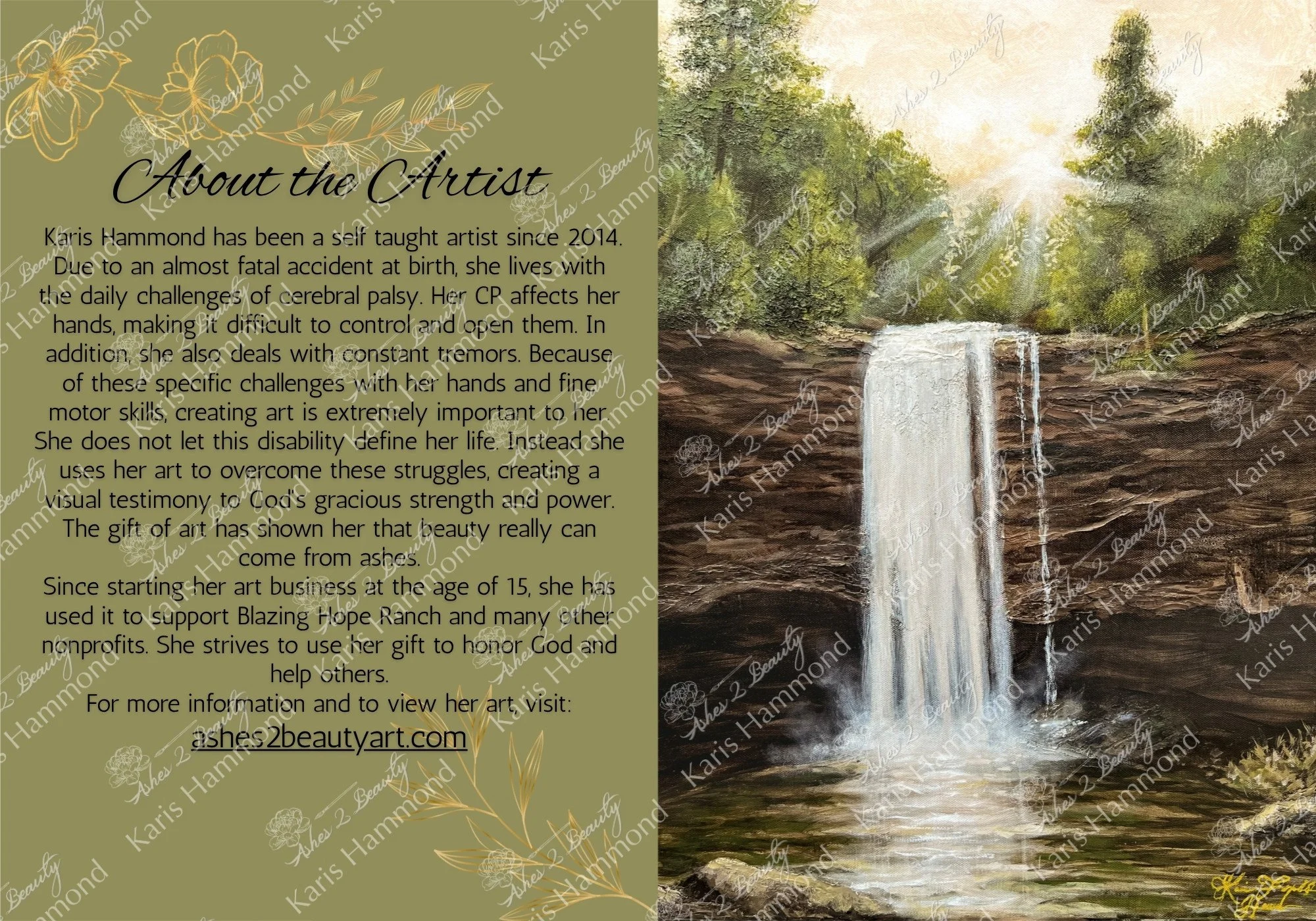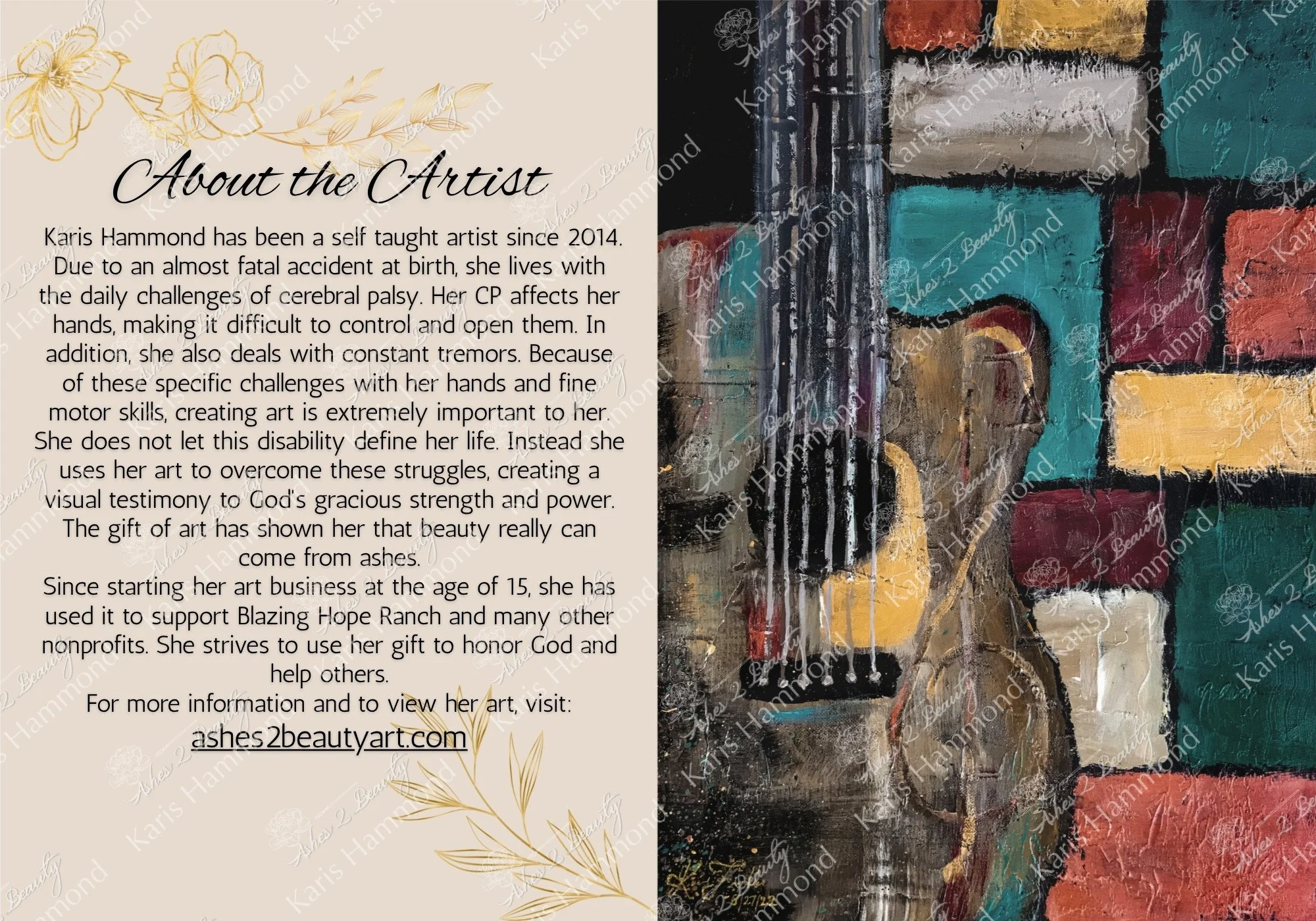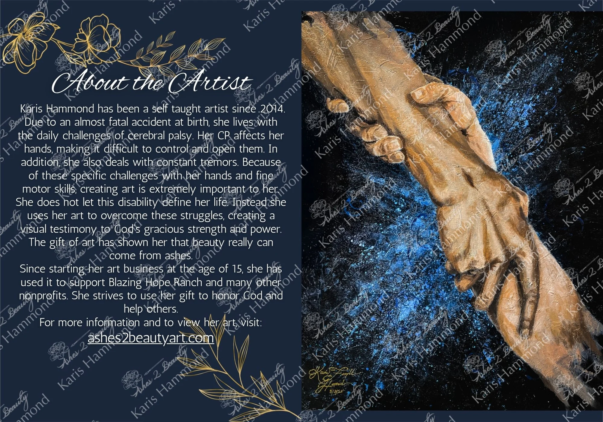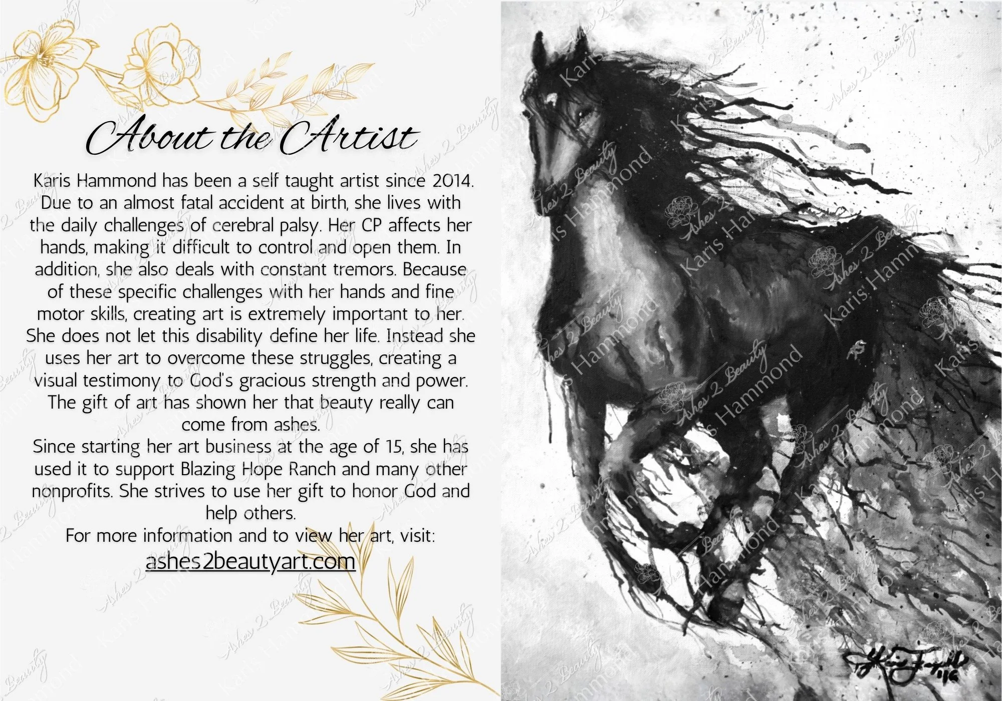 15% of all art sale profits go to the non-profit organization, Blazing Hope Ranch, to help human trafficking survivors
