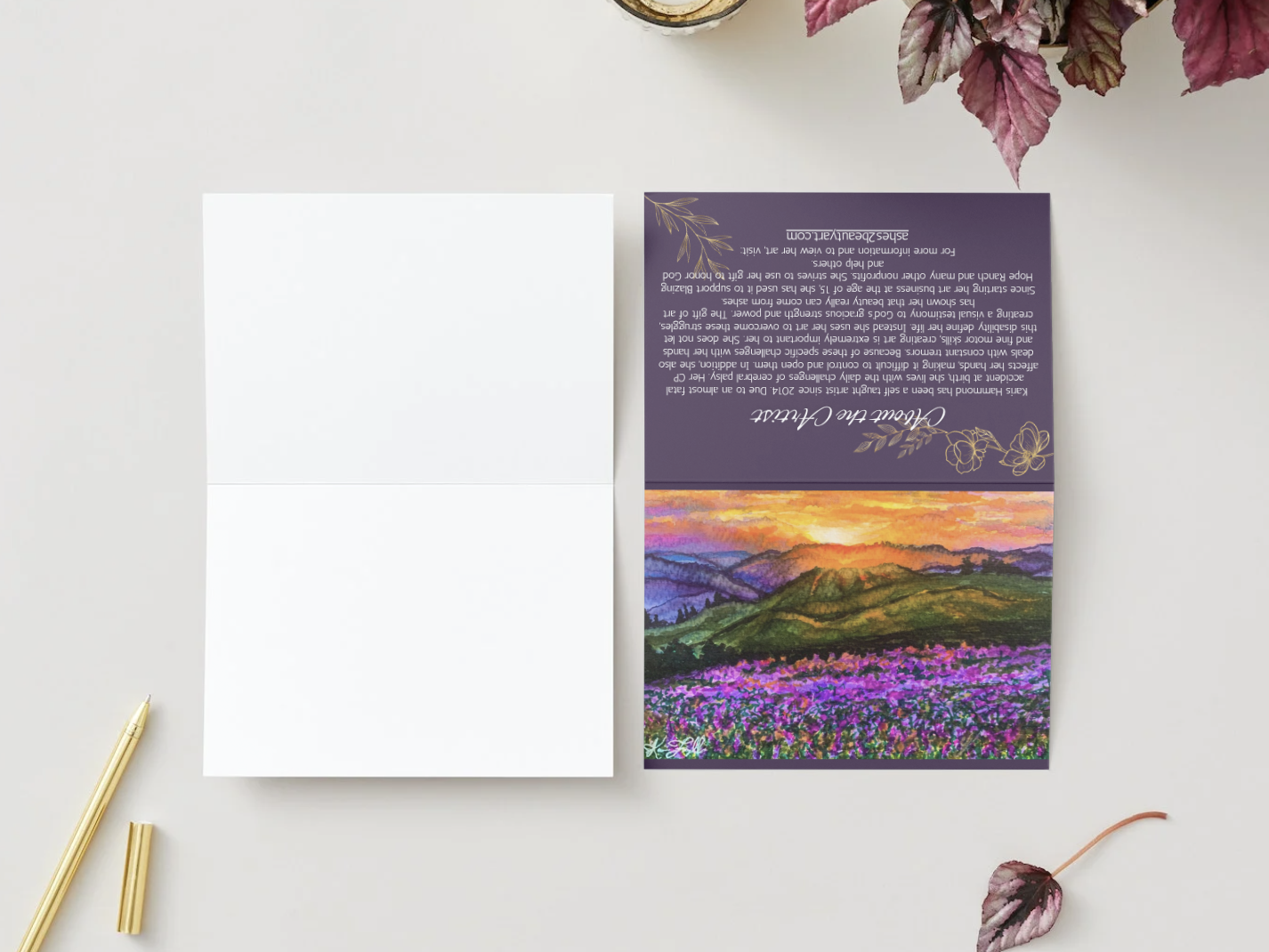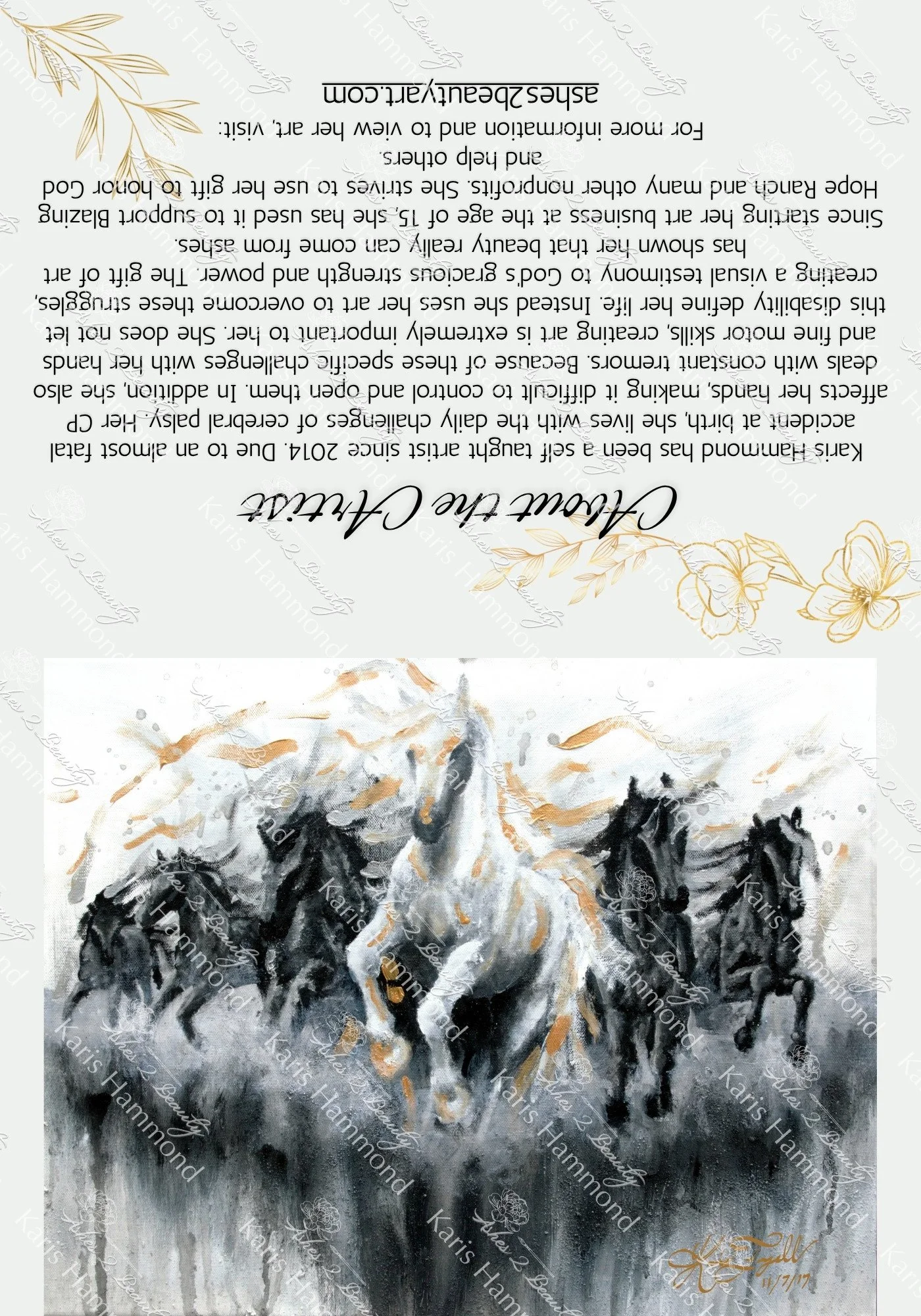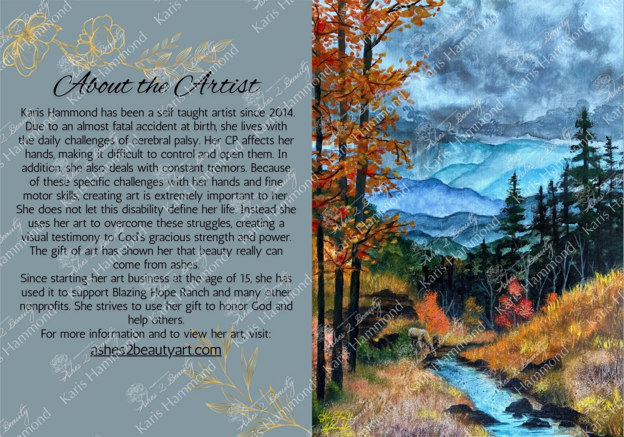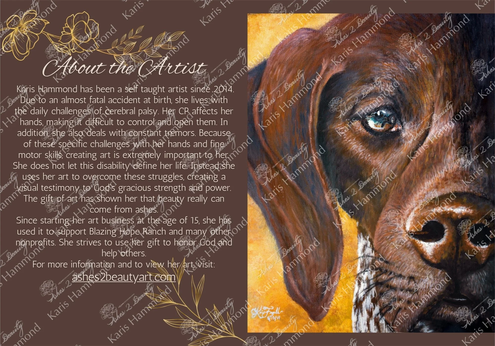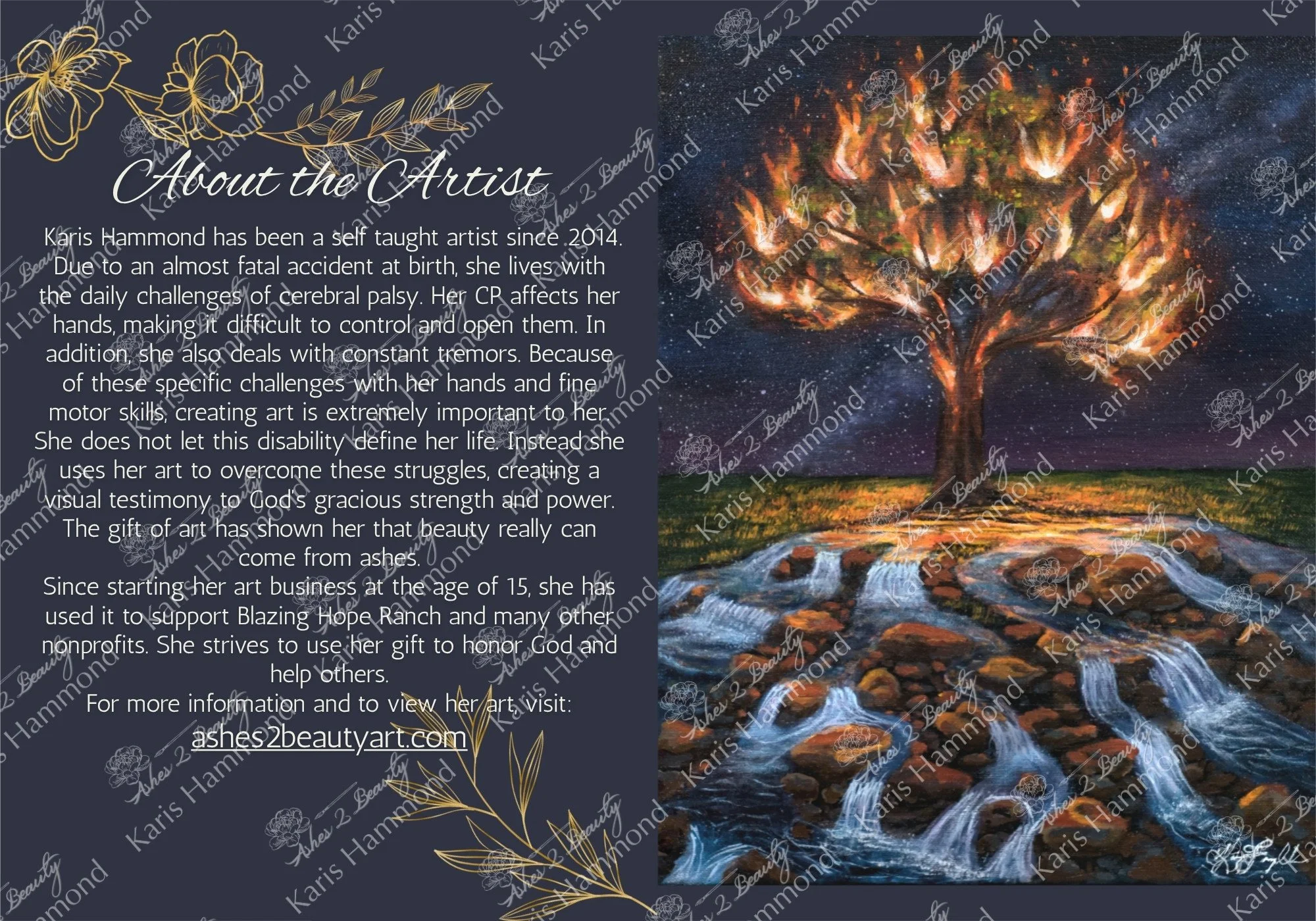 15% of all art sale profits go to the non-profit organization, Blazing Hope Ranch, to help human trafficking survivors